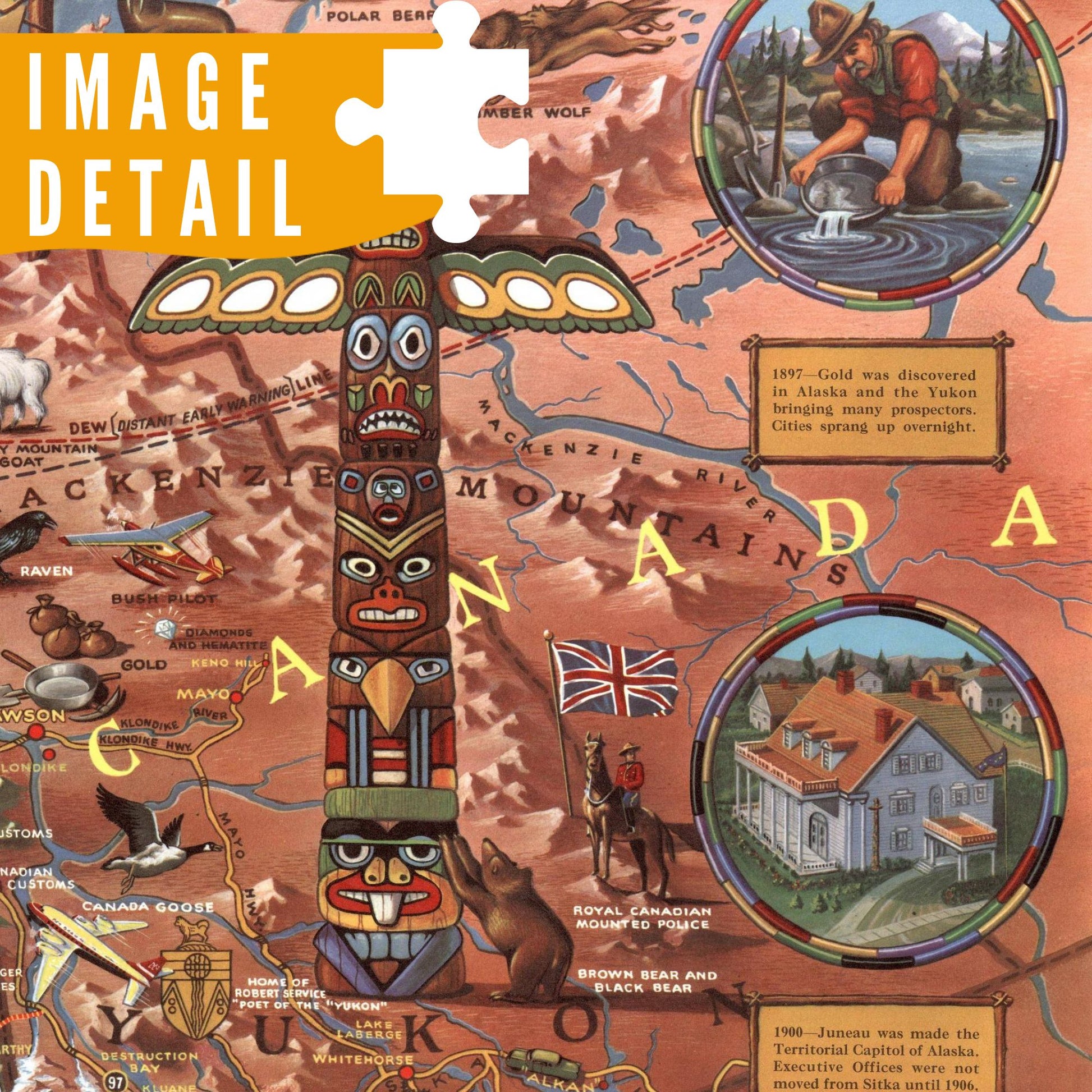 Escape to the untamed wilderness with 'Far North Frontier circa 1959' by KLENG RUDE. Experience the awe-inspiring beauty of Alaska's top 5 touristic spots as depicted in this captivating artwork: the towering glaciers of Kenai Fjords National Park, the rugged peaks of Denali National Park, the stunning Northern Lights in Fairbanks, the vibrant wildlife of Katmai National Park, and the pristine landscapes of Wrangell-St. Elias National Park. Immerse yourself in the nostalgia of these Alaskan wonders as you piece together this exquisite wooden jigsaw puzzle.