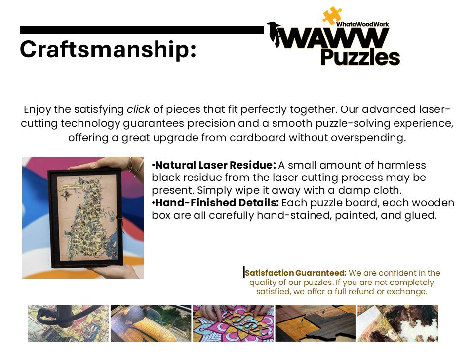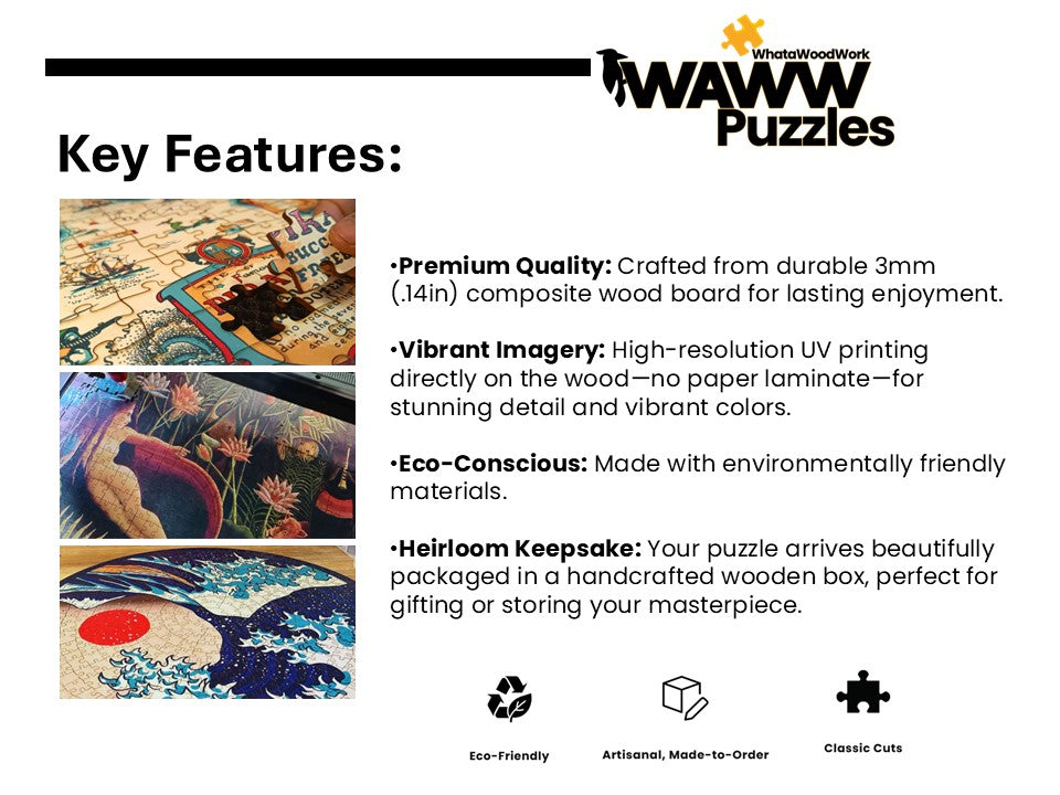 - Artisanal Craftsmanship: Every puzzle is individually primed, hand-painted, and precision-cut, ensuring an unparalleled artisanal vibe, quality, and attention to detail.